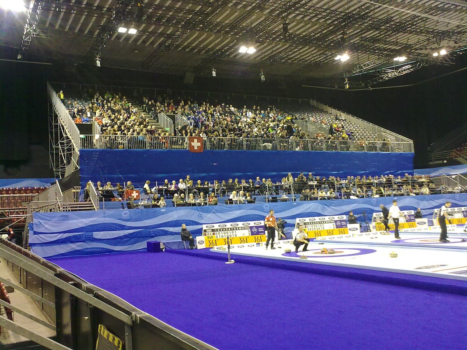 So on the ice this evening in front of a packed house it was Australia v Norway, Scotland v Canada, Sweden v New Zealand and Ireland v Finland - for a full review of the Irish game see Louise Kerr's blog on the Irish Curling Association website here - suffice to say here that the Irish came from behind and took advantage of a dreadful error by the Finnish skip who more or less gifted them a steal of 4 shots to help them win by 8-4.
